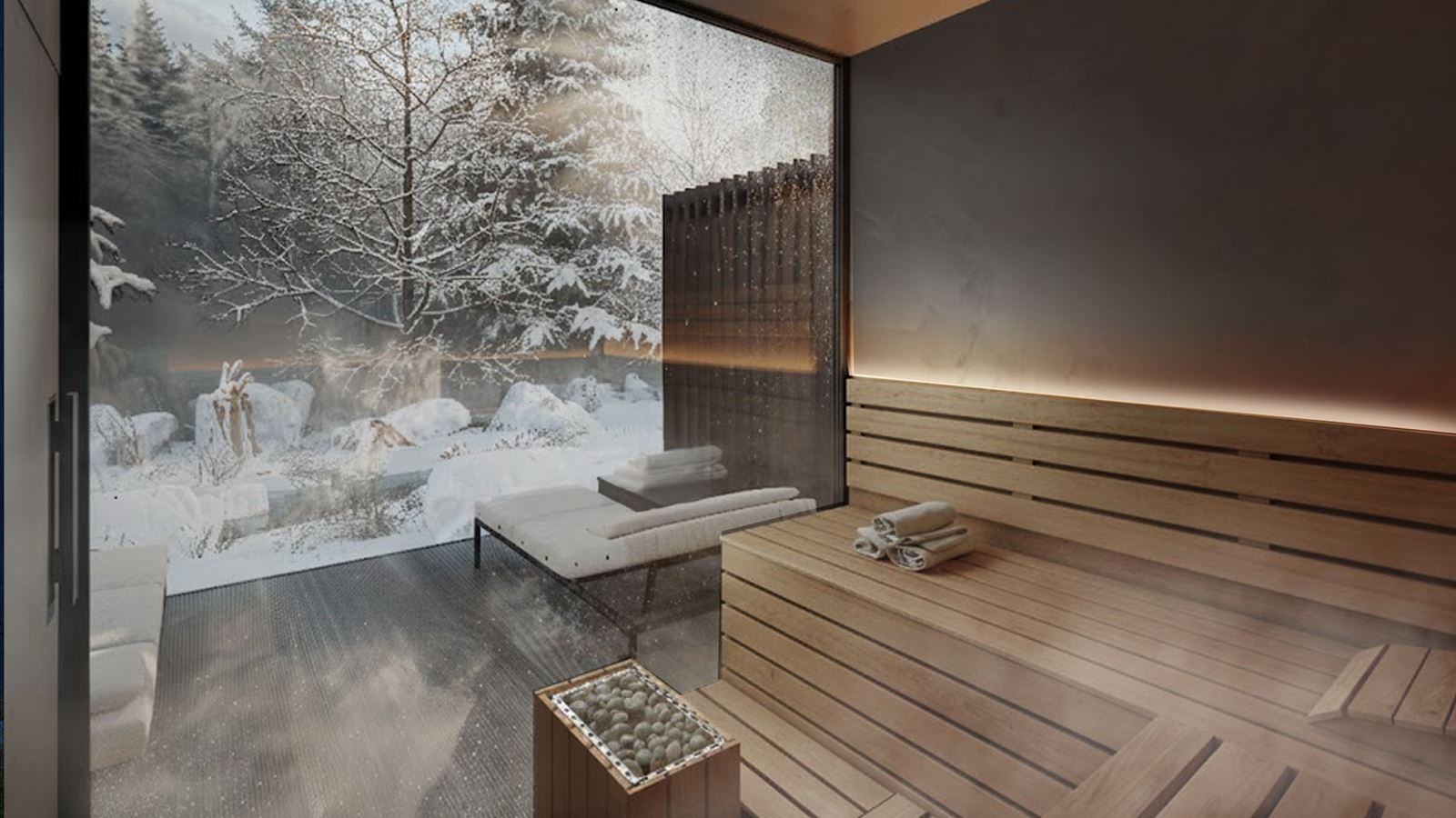 Interijeri zajedničkih prostora kombiniraju modernu arhitekturu i dizajn s tradicionalnim lokalnim materijalima. Zemljani tonovi, tople nijanse drveta i obloge od tamnog crnog škriljevca iz Jeseníka dopunjeni su nježnim, toplim materijalima i nekoliko kamina.